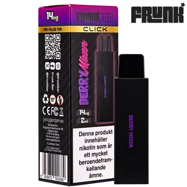 Frunk Pod Click Mesh Berry Mixer 14 mg är en förfylld pod till podsystemet från Frunk som har en kylande smak av blandade bär. Enheten innehåller 14 mg nikotin per ml och batteriet levererar upp till 600 puffar, batteri ingår ej utan ingår när du köper ett startkit. Frunk Pod Click Mesh finns i flera olika smaker som du finner här.