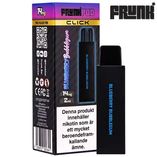 Frunk Pod Click Mesh Blueberry Bubblegum 14 mg är en förfylld pod till podsystemet från Frunk som har en kylande smak av blåbär och tuggummi. Enheten innehåller 14 mg nikotin per ml och batteriet levererar upp till 600 puffar, batteri ingår ej utan ingår när du köper ett startkit.  Frunk Pod Click Mesh finns i flera olika smaker som du finner här.