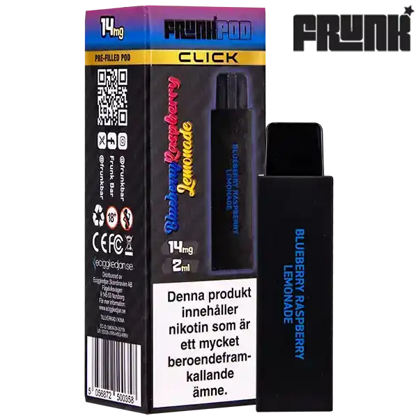 Frunk Pod Click Mesh Blueberry Raspberry Lemonade 14 mg är en förfylld pod till podsystemet från Frunk som har en kylande smak av blåbär, hallon och lemonad. Enheten innehåller 14 mg nikotin per ml och batteriet levererar upp till 600 puffar, batteri ingår ej utan ingår när du köper ett startkit. Frunk Pod Click Mesh finns i flera olika smaker som du finner här.