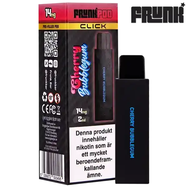 Frunk Pod Click Mesh Cherry Bubblegum 14 mg är en förfylld pod till podsystemet från Frunk som har en kylande smak av körsbär och tuggummi. Enheten innehåller 14 mg nikotin per ml och batteriet levererar upp till 600 puffar, batteri ingår ej utan ingår när du köper ett startkit.  Frunk Pod Click Mesh finns i flera olika smaker som du finner här.