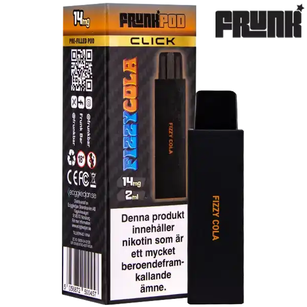 Frunk Pod Click Mesh Fizzy Cola 14 mg är en förfylld pod till podsystemet från Frunk som har en kylande smak av cola. Enheten innehåller 14 mg nikotin per ml och batteriet levererar upp till 600 puffar, batteri ingår ej utan ingår när du köper ett startkit. Frunk Pod Click Mesh finns i flera olika smaker som du finner här.