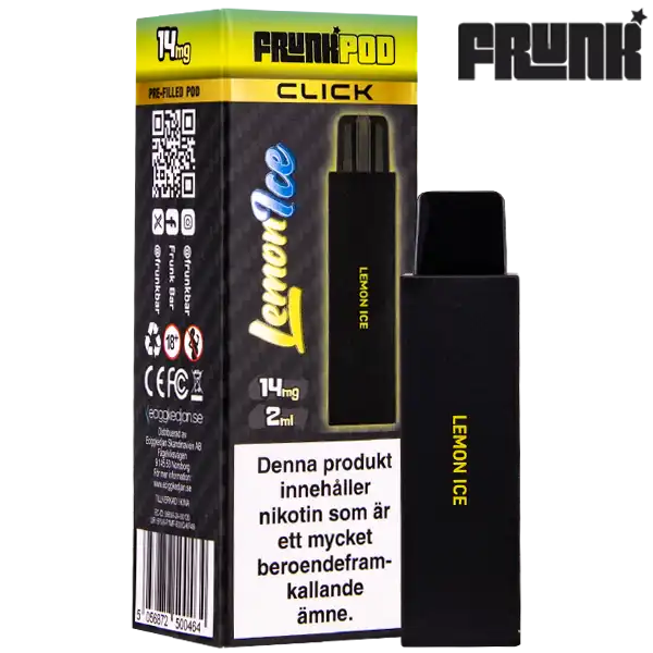 Frunk Pod Click Mesh Lemon Ice 14 mg är en förfylld pod till podsystemet från Frunk som har en kylande smak av lemonad. Enheten innehåller 14 mg nikotin per ml och batteriet levererar upp till 600 puffar, batteri ingår ej utan ingår när du köper ett startkit.  Frunk Pod Click Mesh finns i flera olika smaker som du finner här.