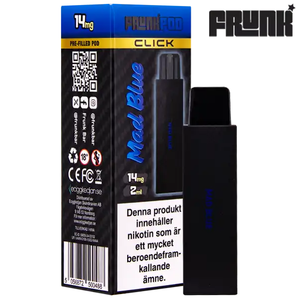 Frunk Pod Click Mesh Mad Blue 14 mg är en förfylld pod till podsystemet från Frunk som har en kylande smak av blåbär, hallon och svarta vinbär. Enheten innehåller 14 mg nikotin per ml och batteriet levererar upp till 600 puffar, batteri ingår ej utan ingår när du köper ett startkit. Frunk Pod Click Mesh finns i flera olika smaker som du finner här.