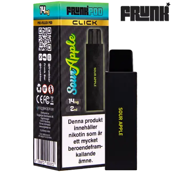 Frunk Pod Click Mesh Sour Apple 14 mg är en förfylld pod till podsystemet från Frunk som har en kylande smak av äpple. Enheten innehåller 14 mg nikotin per ml och batteriet levererar upp till 600 puffar, batteri ingår ej utan ingår när du köper ett startkit. Frunk Pod Click Mesh finns i flera olika smaker som du finner här.
