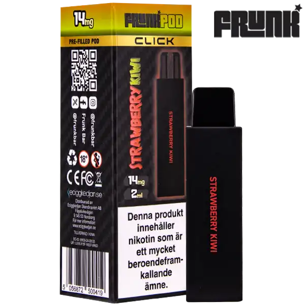 Frunk Pod Click Mesh Strawberry Kiwi 14 mg är en förfylld pod till podsystemet från Frunk som har en kylande smak av jordgubb och kiwi. Enheten innehåller 14 mg nikotin per ml och batteriet levererar upp till 600 puffar, batteri ingår ej utan ingår när du köper ett startkit. Frunk Pod Click Mesh finns i flera olika smaker som du finner här.