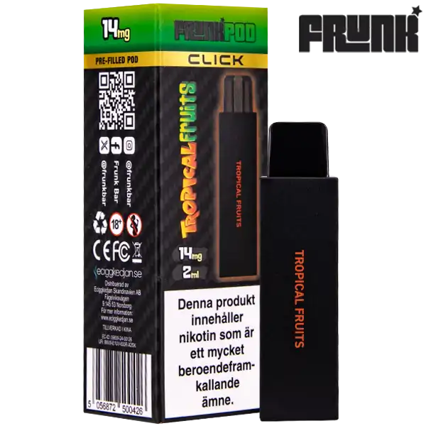 Frunk Pod Click Mesh Tropical Fruits 14 mg är en förfylld pod till podsystemet från Frunk som har en kylande smak av tropiska frukter. Enheten innehåller 14 mg nikotin per ml och batteriet levererar upp till 600 puffar, batteri ingår ej utan ingår när du köper ett startkit. Frunk Pod Click Mesh finns i flera olika smaker som du finner här.