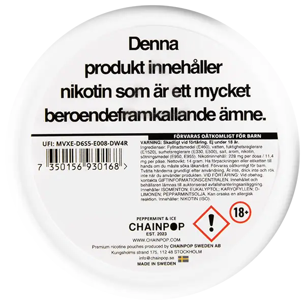 Tillverkare av portionssnuset Chainpop Peppermint & Ice 11,4 mg är: Chainpop AB.