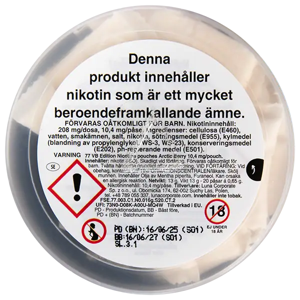 En dosa med 77 Arctic Berry Valtteri Bottas Edition 10,4 mg innehåller totalt 208 mg nikotin, 16 mg per gram och 10,4 mg per prilla.