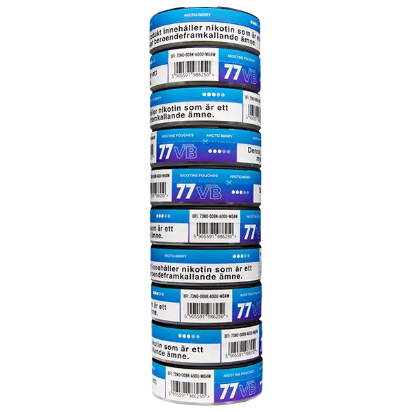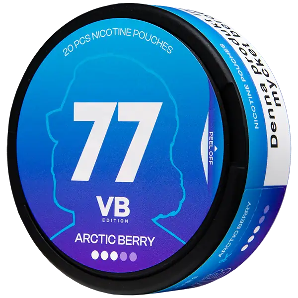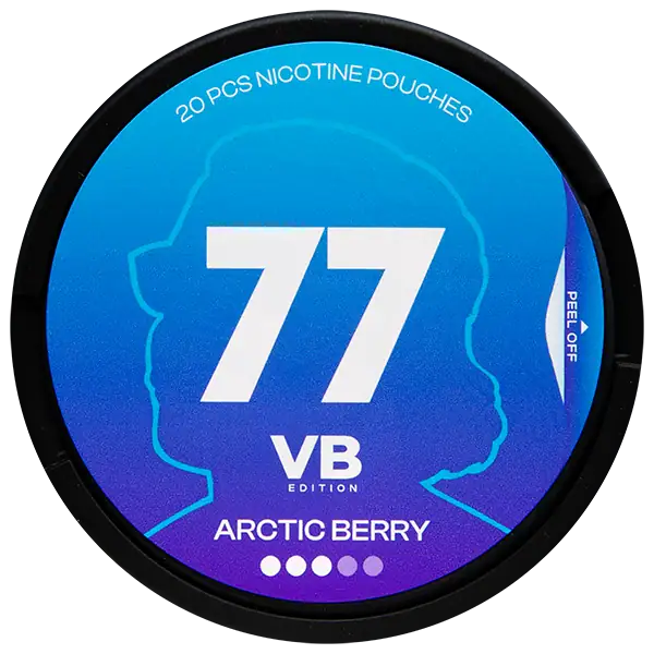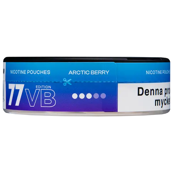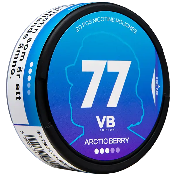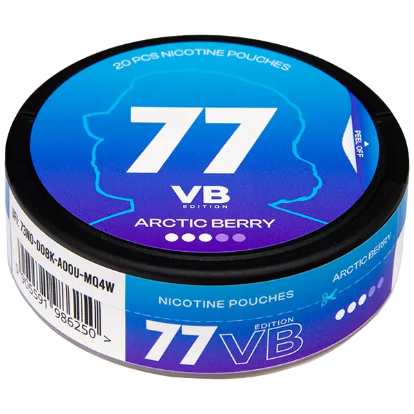 77 Arctic Berry VB Edition Medium 10,4 mg är ett tobaksfritt all white portionssnus med smak av arktiska skogsbär. Smaken av skogsbär bidrar till en tydlig och unik upplevelse som varar i cirka 30 minuter. Portionssnuset innehar en nikotinhalt på 16 mg/g nikotin och prillorna är slimmade. Prillorna i 77 Arctic Berry upplevs som mycket diskreta, precis som avsikten med ett portionssnus i slimformat förväntas vara.