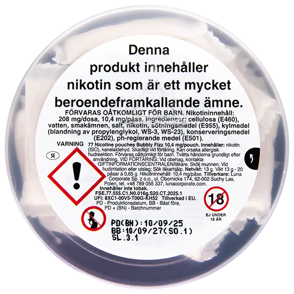Samtliga dosor till 77 Nicotine Pouches är tillverkade i plast. När din Bubbly Fizz är slut ska du sortera den som plast på din närmaste avfallsanläggning.