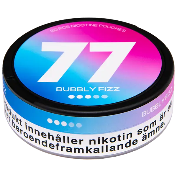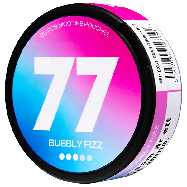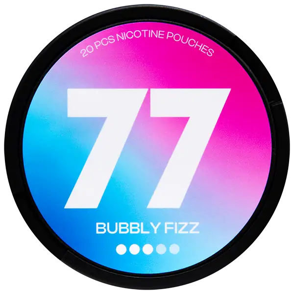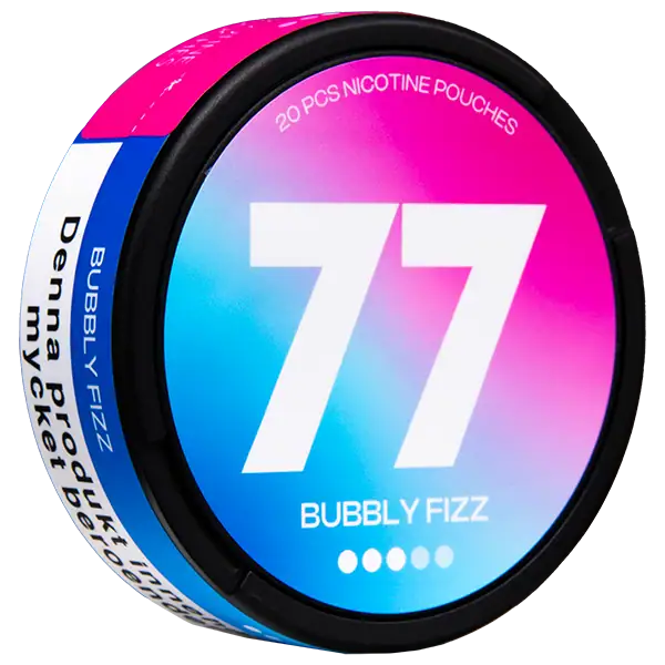 77 Bubbly Fizz Medium 10,4 mg är tobaksfria, all white nikotinpåsar med smak av frukt och bär. Smaken av frukt och bär bidrar till en tydlig och unik upplevelse som varar i cirka 30 minuter. Nikotinpåsar innehar en nikotinhalt på 16 mg/g nikotin och prillorna är slimmade.