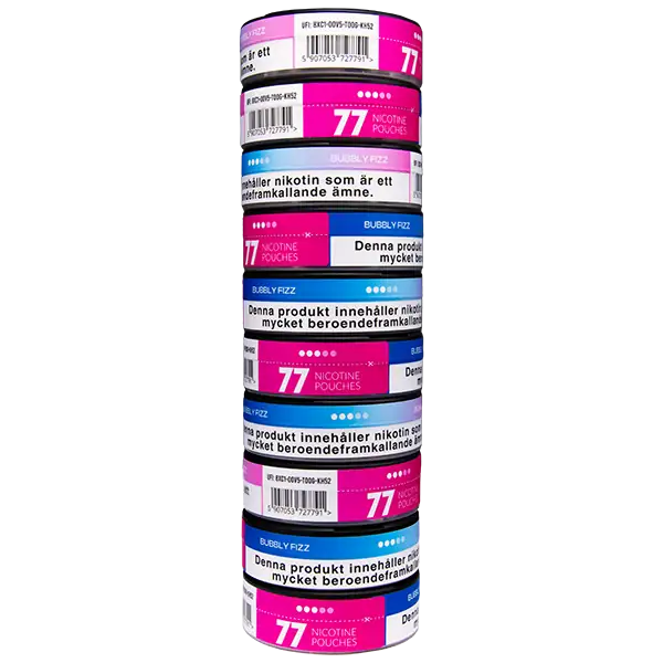 Portionspåsarna i 77 Bubbly Fizz upplevs som mycket diskreta, precis som avsikten med prillor i slimformat förväntas vara. Slimformat innebär att prillan är smalare och längre än en vanliga portioner. 77 kommer i flera olika smaker. Vill du se hela utbudet av varumärket 77 kan du klicka här.
