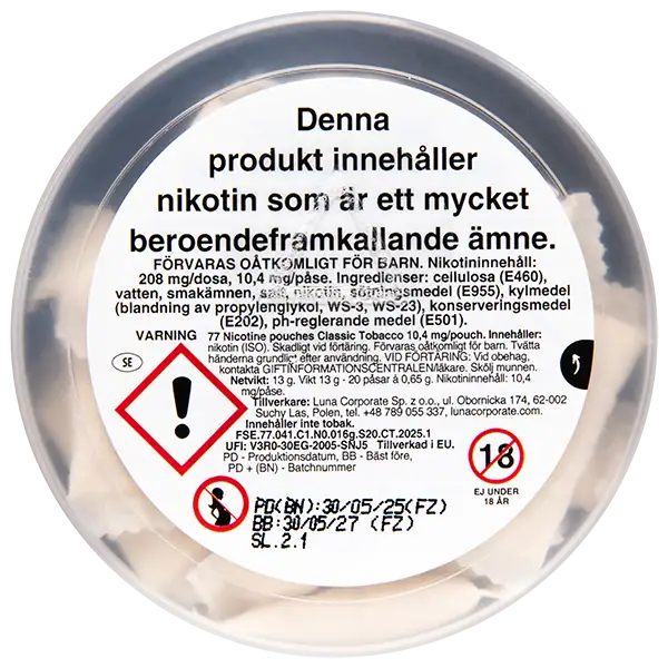 Tillverkare av portionssnuset 77 Classic Tobacco är: Luna Corporate.