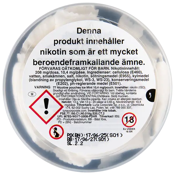 En dosa med 77 Ice Mint Medium innehåller totalt 208 mg nikotin, 16 mg per gram och 10,4 mg per prilla.