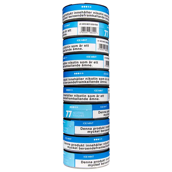 Samtliga dosor till 77 Nicotine Pouches är tillverkade i plast. När din Ice Mint är slut ska du sortera den som plast på din närmaste avfallsanläggning.