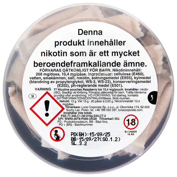 Samtliga dosor till 77 Nicotine Pouches är tillverkade i plast. När din Raspberry Ice är slut ska du sortera den som plast på din närmaste avfallsanläggning.