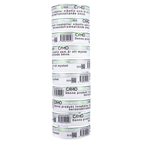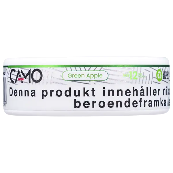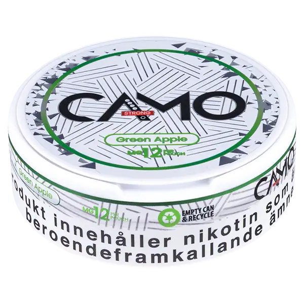 CAMO Green Apple Strong 12 mg är ett tobaksfritt all white portionssnus med smak av grönt äpple. Smaken av gröna äpplen bidrar till en mycket tydlig och unik upplevelse som varar i cirka 30 minuter. Nikotinpåsarna innehar en nikotinhalt på 12 mg per portionsprilla och prillorna är slimmade.