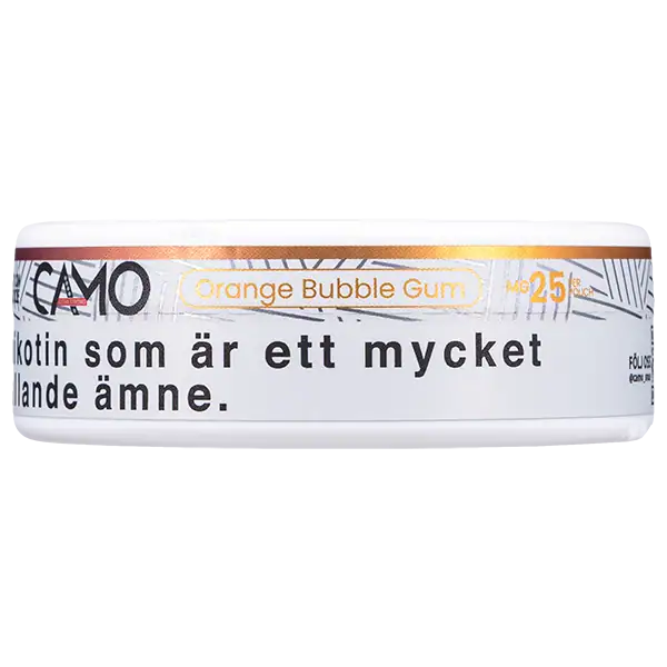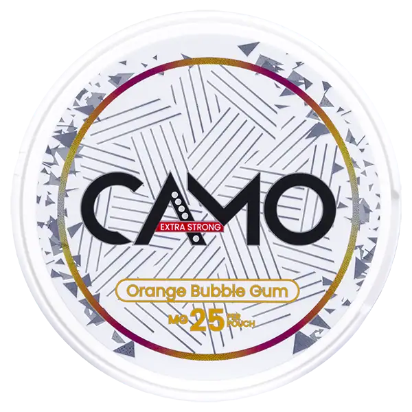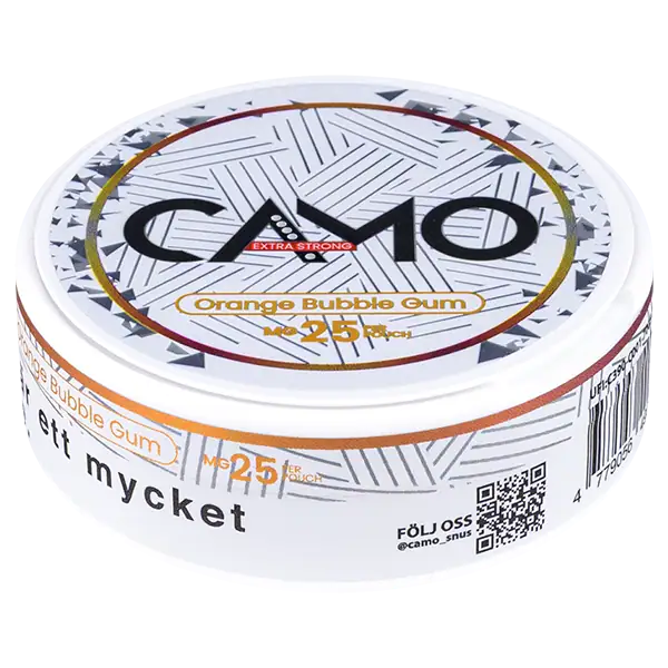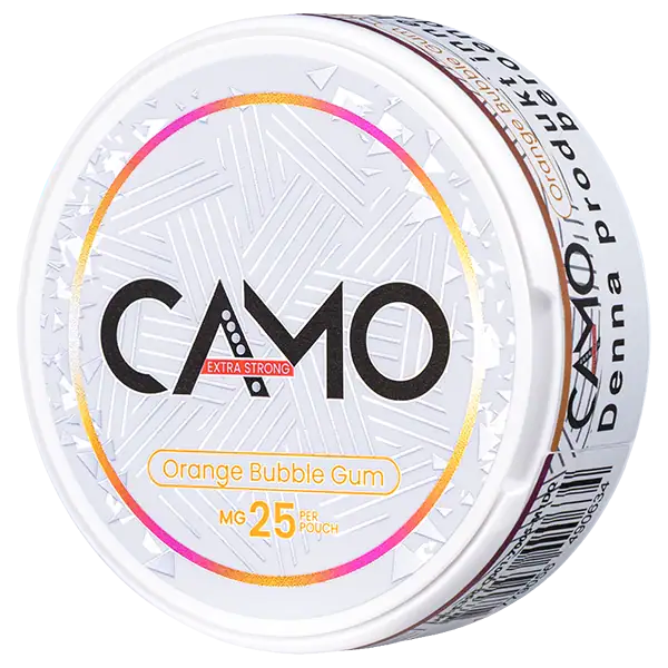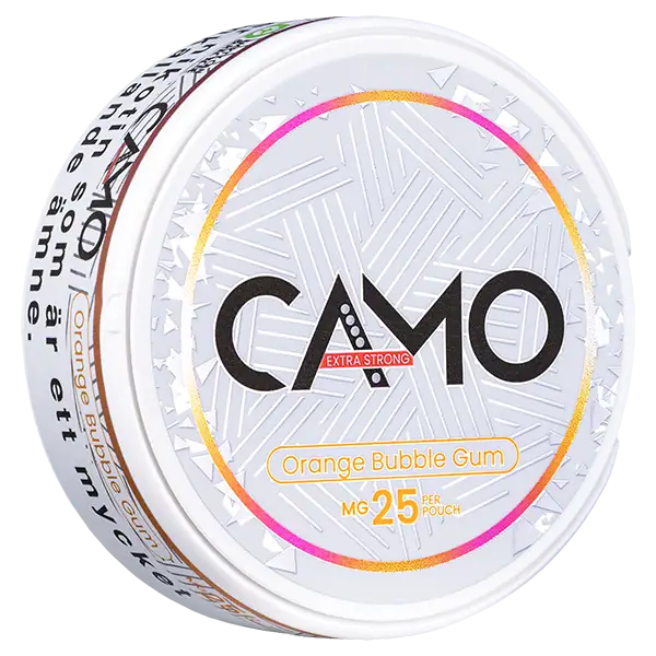 CAMO Orange Bubble Gum Extra Strong 25 mg är ett tobaksfritt all white portionssnus med smak av apelsin och klassisk tuggummi. Smaken av apelsin och tuggummi bidrar till en mycket tydlig och unik upplevelse som varar i cirka 30 minuter. Nikotinpåsarna innehar en nikotinhalt på 25 mg per portionsprilla och prillorna är slimmade.