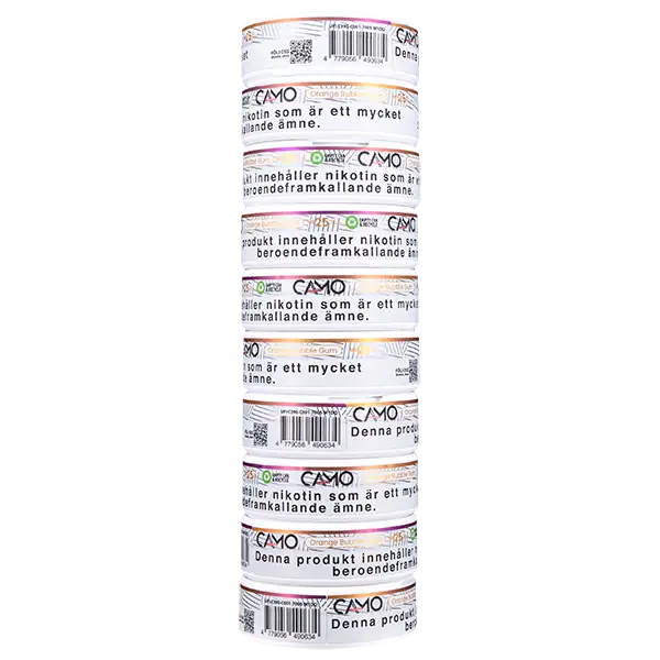 Varje dosa av CAMO innehåller 20 stycken prillor och snusdosorna säljes styckvis. Vid beställning av 10 stycken dosor eller fler så aktiverar du automatiskt prisstegen. En stock med CAMO innehåller tio dosor med portionssnus. En stock snus levereras dock i ett platt brevpack (flatpack) så att de kan skickas direkt hem till din brevlåda med minsta miljöpåverkan.