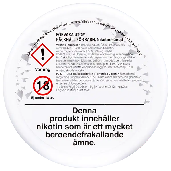- Nikotinhalt: 240 mg/dosa, 16 mg/g och 12 mg/prilla.