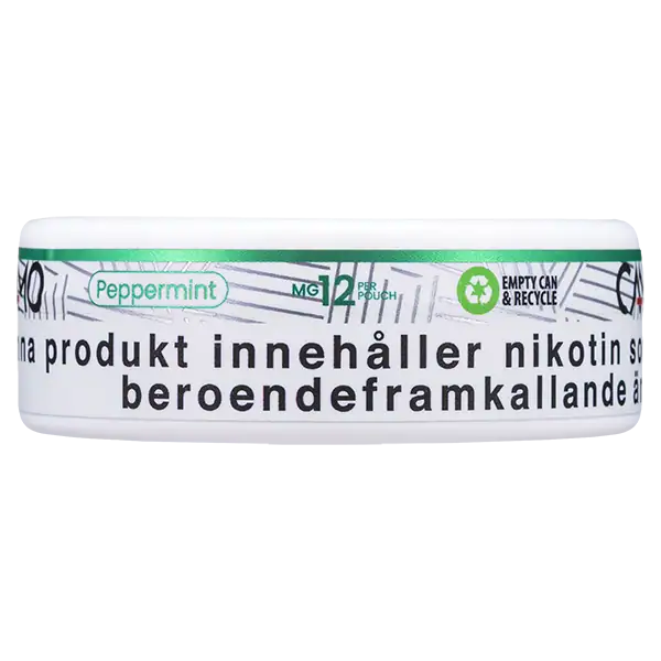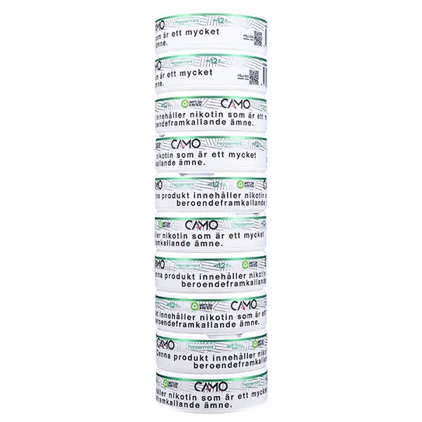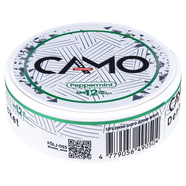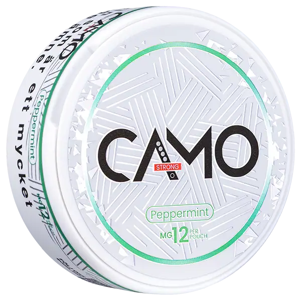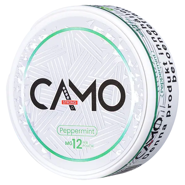 CAMO Peppermint Strong 12 mg är ett tobaksfritt all white portionssnus med smak av pepparmint. Smaken av pepparmint bidrar till en mycket tydlig och unik upplevelse som varar i cirka 30 minuter. Nikotinpåsarna innehar en nikotinhalt på 12 mg per portionsprilla och prillorna är slimmade.