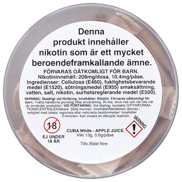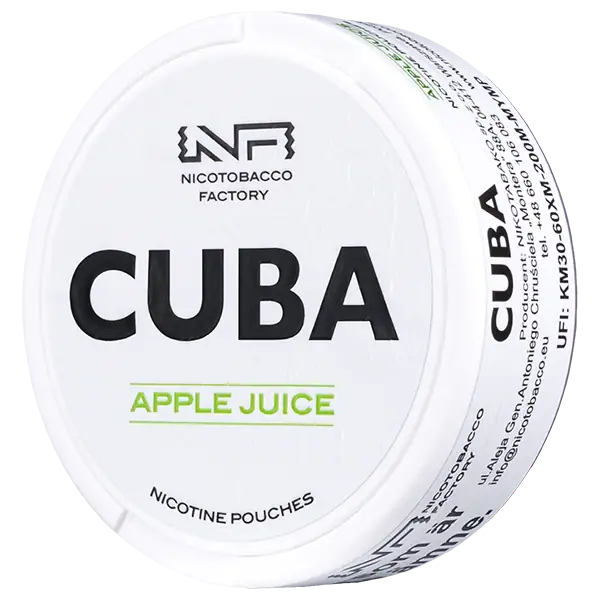 CUBA Apple Juice White 16 mg är ett tobaksfritt all white portionssnus med smak av äpple. Smaken av äpple bidrar till en tydlig och unik upplevelse som varar i cirka 30 minuter. Nikotinpåsarna innehar en nikotinhalt på 10,4 mg per portionsprilla och prillorna är slimmade. Prillorna i CUBA Apple Juice White 16 mg är vita och upplevs som mycket diskreta, precis som avsikten med ett portionssnus i slimformat förväntas vara.