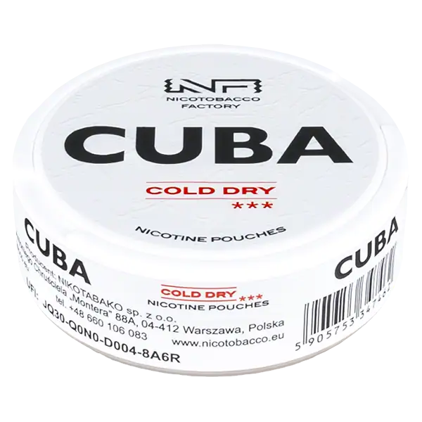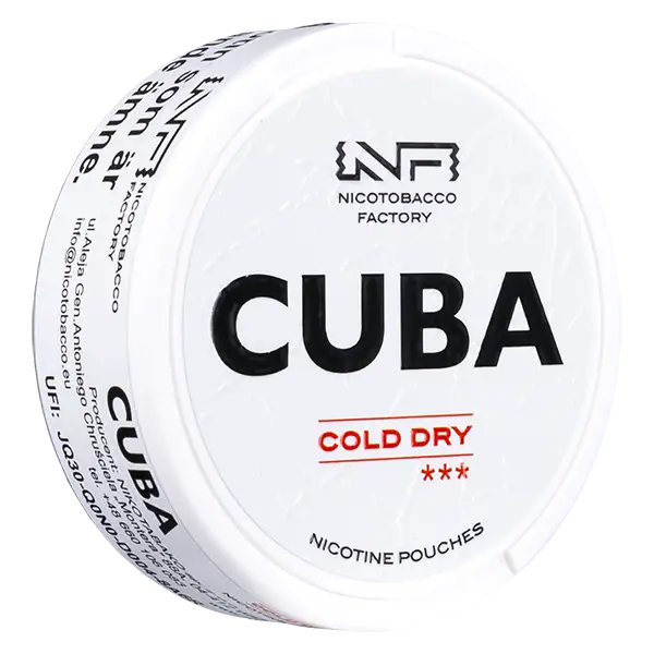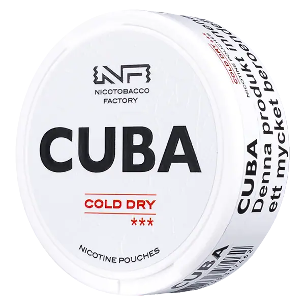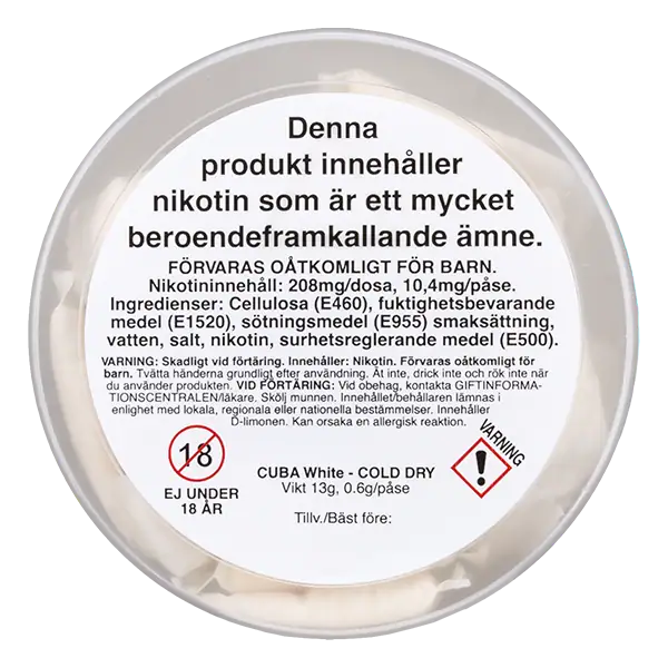 CUBA Cold Dry White 16 mg är ett tobaksfritt all white portionssnus med smak av mint. Smaken av mint bidrar till en tydlig och unik upplevelse som varar i cirka 30 minuter. Nikotinpåsarna innehar en nikotinhalt på 10,4 mg per portionsprilla och prillorna är slimmade. Prillorna i CUBA Cold Dry White 16 mg är vita och upplevs som mycket diskreta, precis som avsikten med ett portionssnus i slimformat förväntas vara.