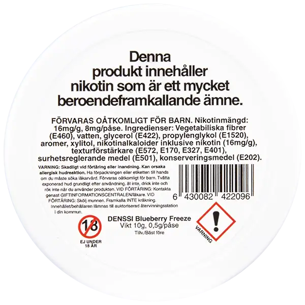 Denssi Blueberry Freeze är ett tobaksfritt all white portionssnus med en intensiv smakprofil av blåbär. Prillorna i Denssi Blueberry Freeze är vita, slimmade och innehåller 8 mg nikotin per portionspåse.