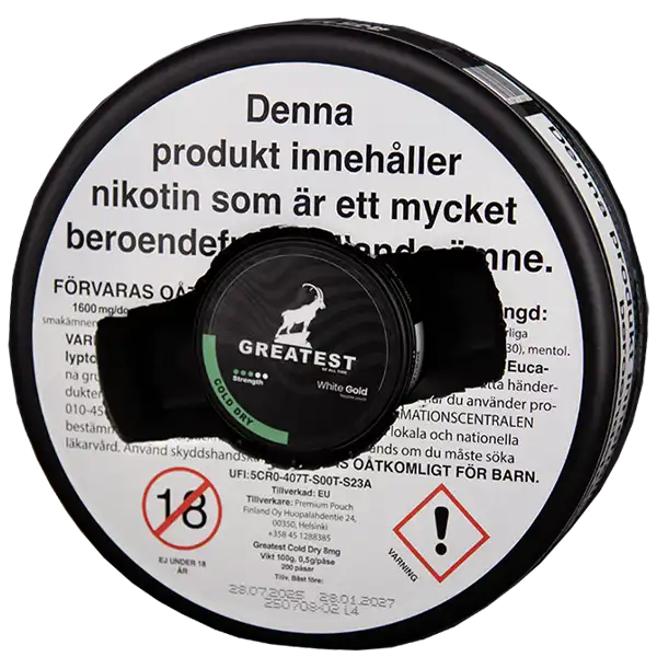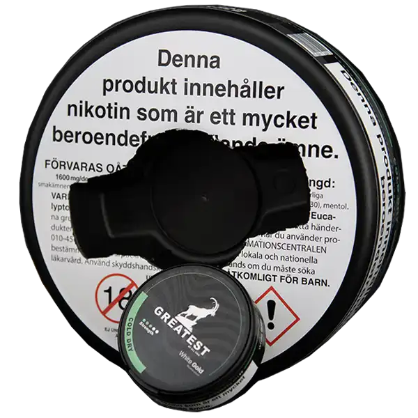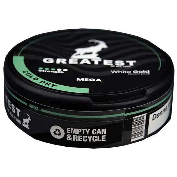 Greatest Cold Dry MEGACAN kommer levererad i en megastor dosa. Den motsvarar ungefär 10 vanliga dosor. Greatest Cold Dry MEGACAN är ett tobaksfritt all white portionssnus med en smak av mint. Mintsmaken ger en långvarig upplevelse som varar i upp till 30 minuter.