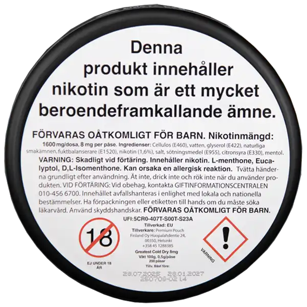 Prillorna i Greatest Cold Dry MEGACAN är helvita och levereras i ett slim format. Varje prilla innehåller 8 mg nikotin, vilket klassar den som normal nikotinstyrka. En dosa innehåller totalt 1600 mg nikotin.