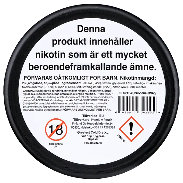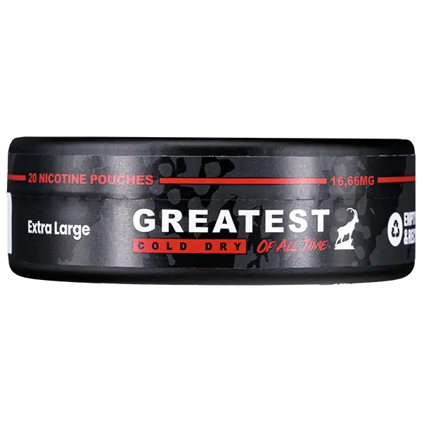 Prillorna i Greatest Cold Dry XL är helvita och levereras i ett extra stort format. Varje prilla innehåller 13 mg nikotin, vilket klassar den som medium stark. En dosa innehåller totalt 266,4 mg nikotin. Nikotinhalten gör Greatest Cold Dry XL till ett populärt val bland alla användare av all white portionssnus som är ute efter en normal nikotinhalt.
