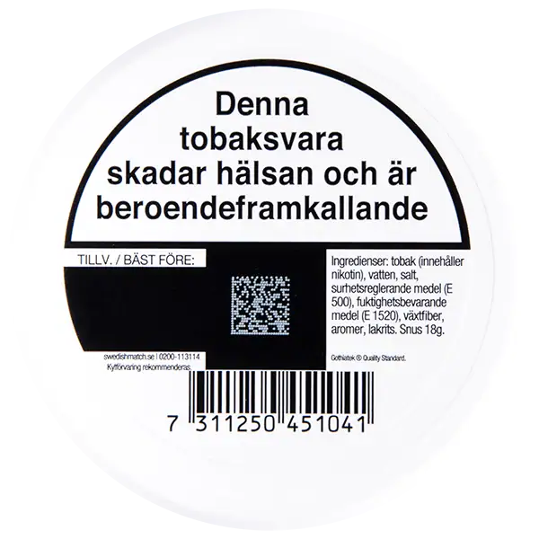 Tobak, vatten, salt, surhetsreglerande medel (E 500), fuktighetsbevarande medel (E 1520), växtfiber, aromer, lakrits.