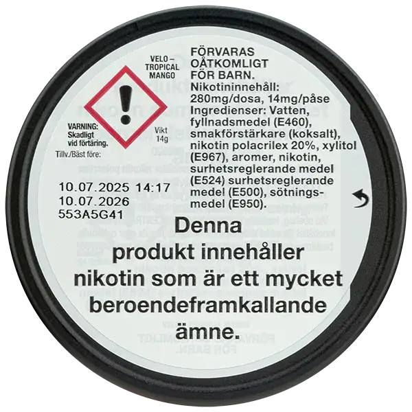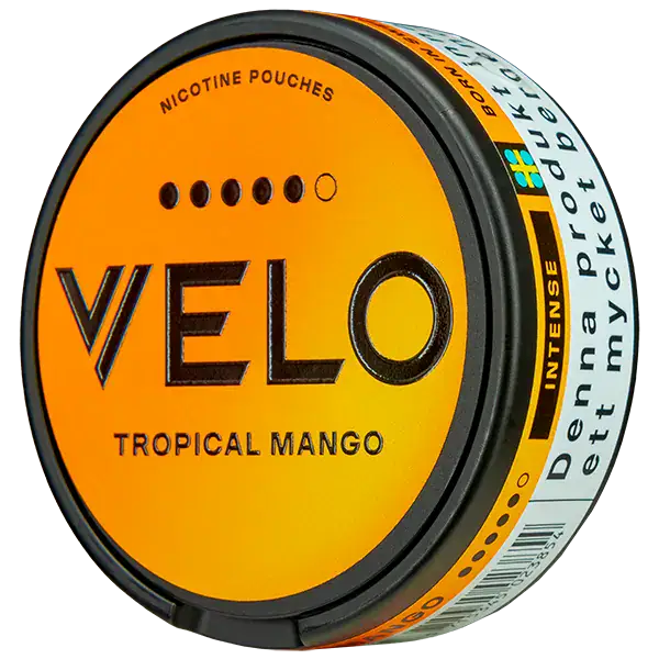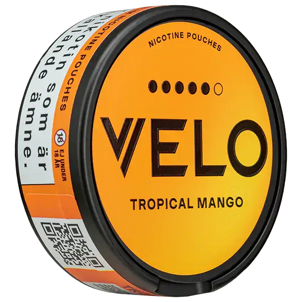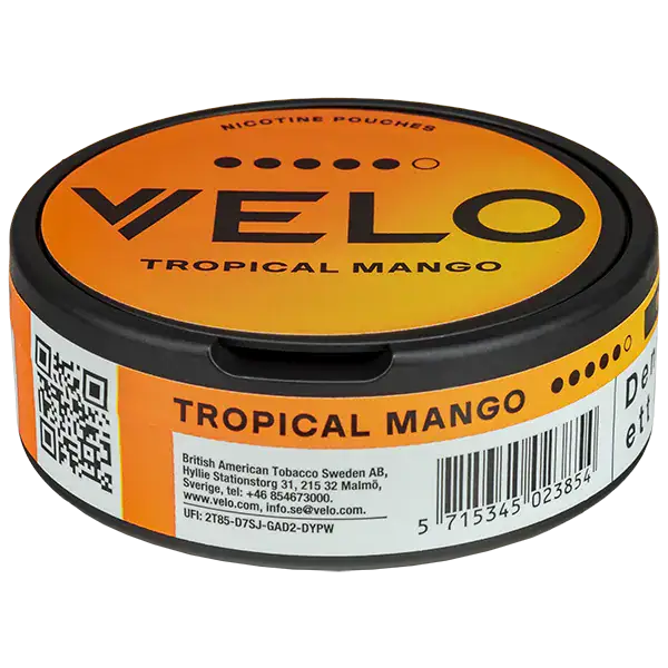 VELO Tropical Mango 14 mg är tobaksfritt och har en smak utav mango, passionsfrukt och mandarin. Produkten innehåller 20 mg/g nikotin och nikotinpåsarna har formatet slim. Dessutom är nikotinpåsarna tillverkade av hela naturliga fiber från tall och eukalyptus med tillsatt nikotinextrakt som man utvunnit från tobak.