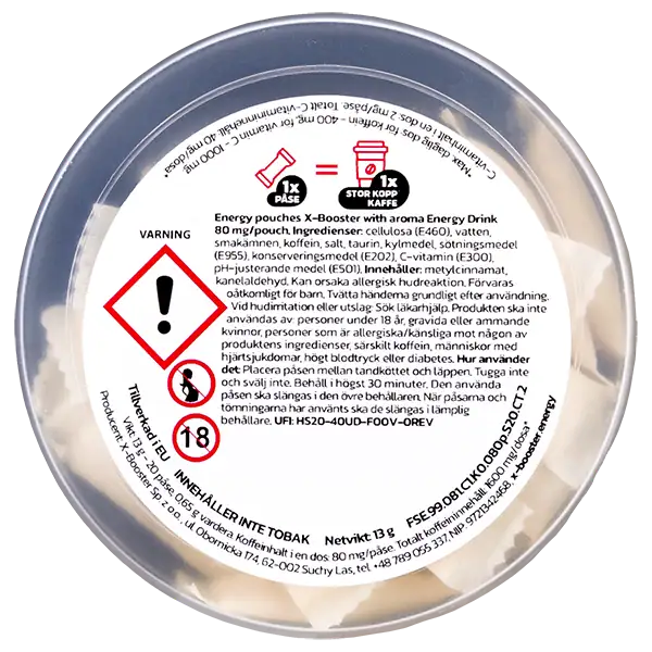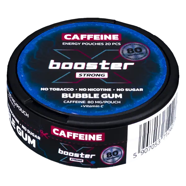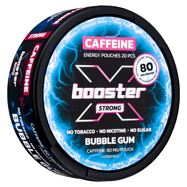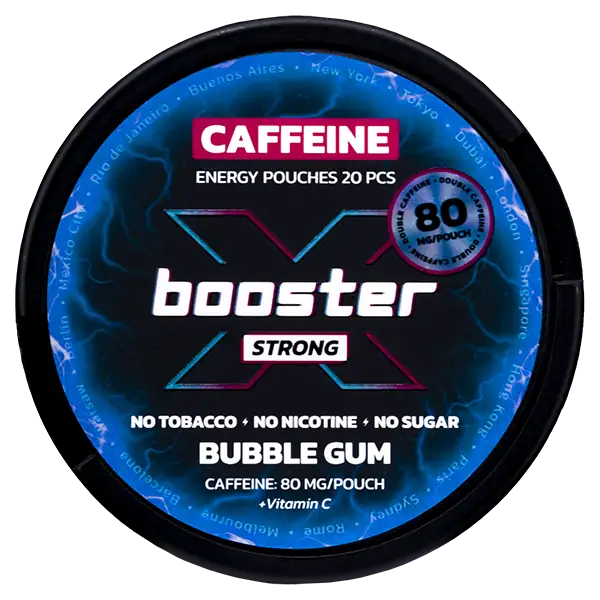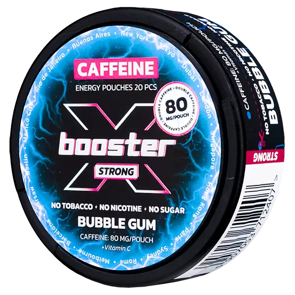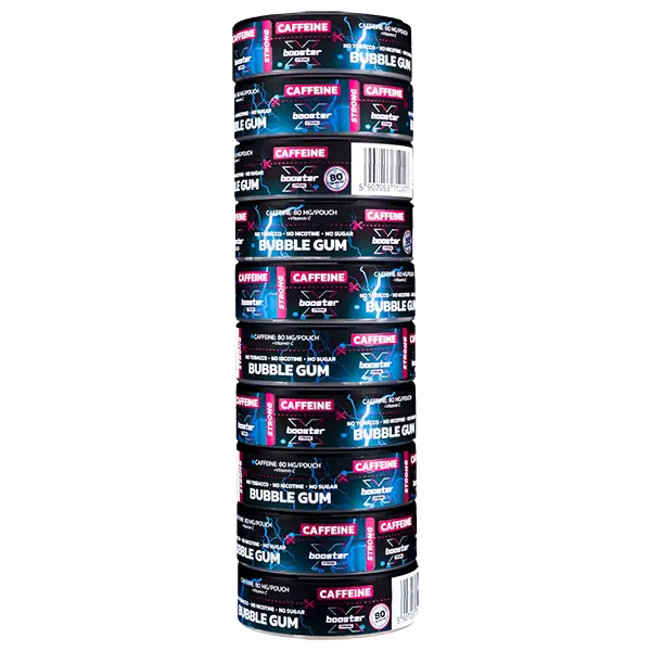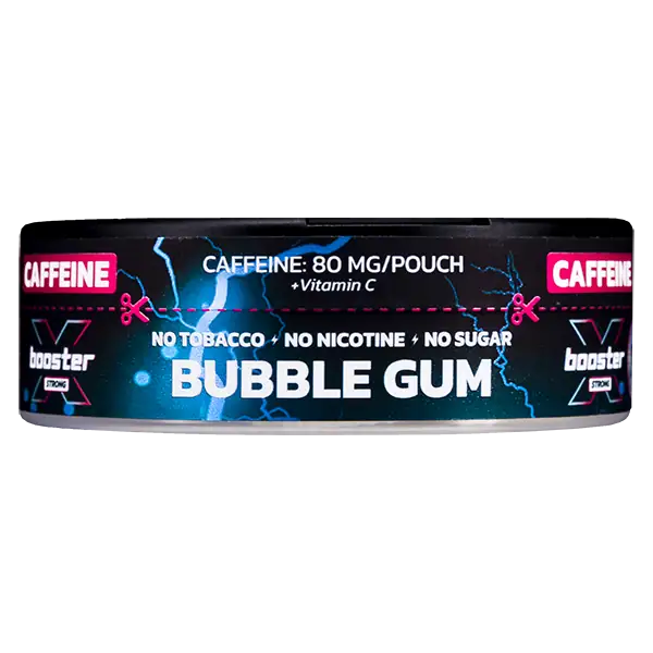 X-Booster Caffeine Bubble Gum är tobak och nikotinfria påsar med en hög koffeinhalt på 80 mg/prilla som ger en energikick. Bubble Gum är även sockerfri och har tydliga smaker av tuggummi.