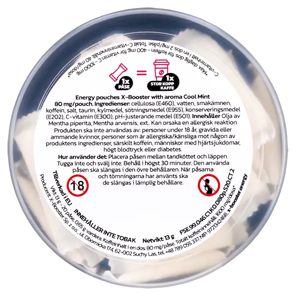 X-Booster Caffeine Cool Mint är energipåsar utan tobak och nikotin som innehåller 80 mg koffein med en tydlig smak av mint.