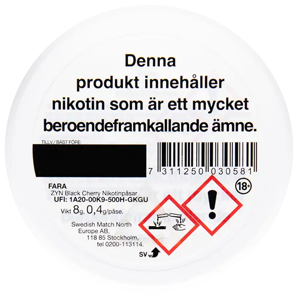 Tillverkare av ZYN Black Cherry Mini Dry Strong Portion är: Swedish Match North Europe AB och här kan du läsa mer.