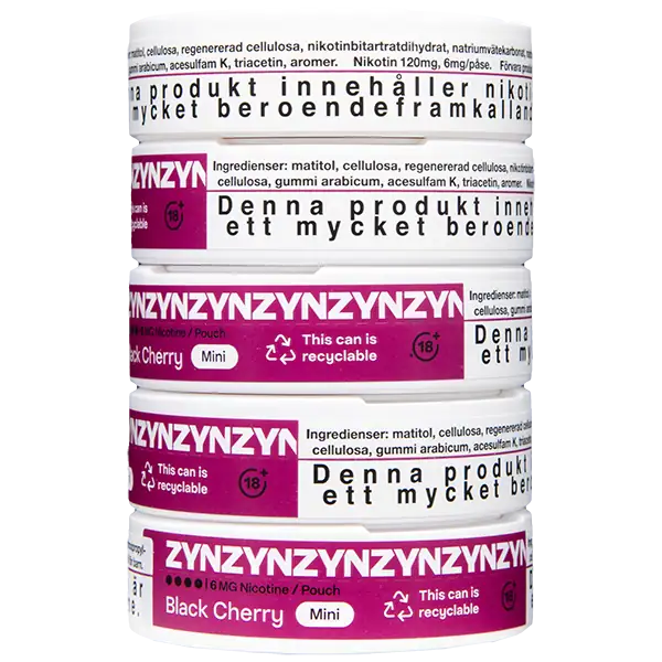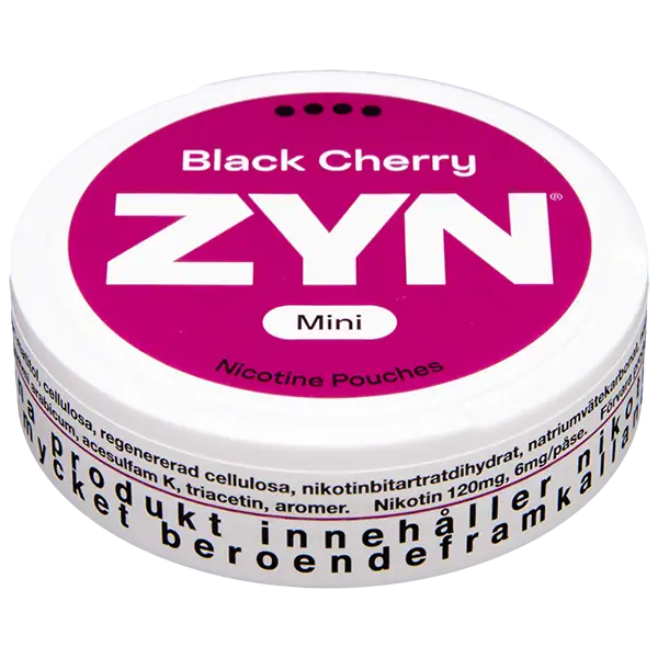 ZYN Black Cherry Mini Dry Strong doftar ingen tobak alls och har en ganska stark smaksättning utav fruktsmak som i sin tur gör att smaken håller i sig längre. Även om dessa nikotinpåsar ofta kommer i slimformat har man genom det tillsatta nikotinet samma nikotinmängd som i en vanlig portionssnus.