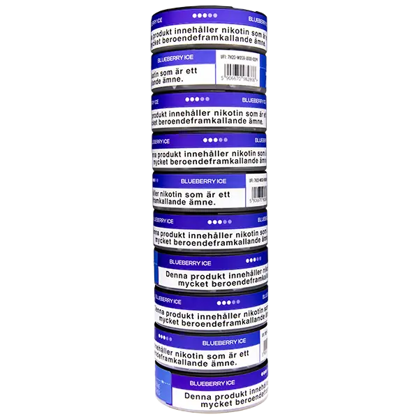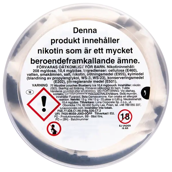 Samtliga dosor till 77 Nicotine Pouches är tillverkade i plast. När din Blueberry Ice är slut ska du sortera den som plast på din närmaste avfallsanläggning.