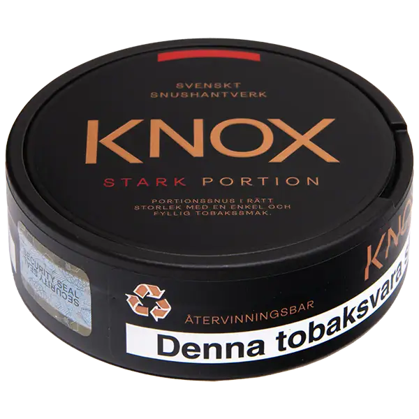 Skruf Knox Stark Portionssnus är ett portionssnus som har smak av klassisk tobak med inslag av citrus. Detta är ett portionssnus i originalutförande vilket innebär att prillan är något fuktigare och ger en snabbare smakupplevelse.