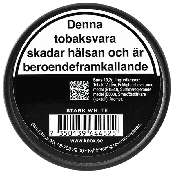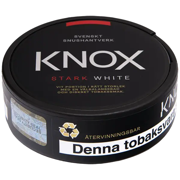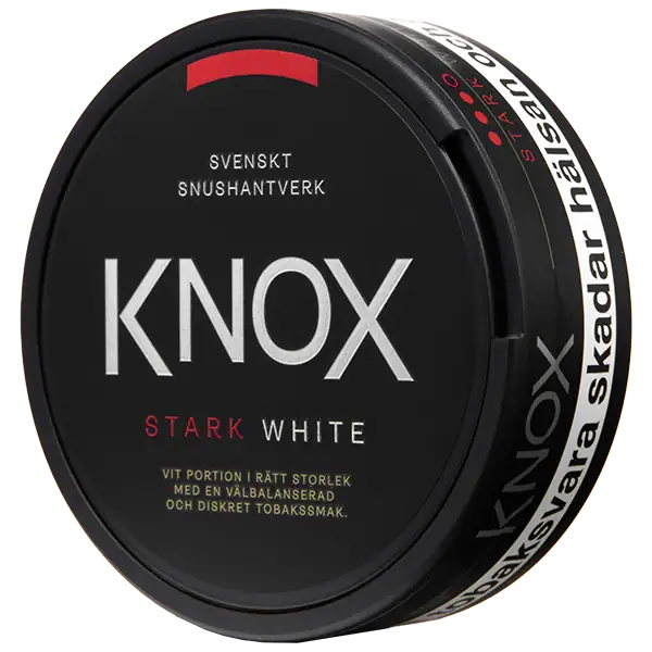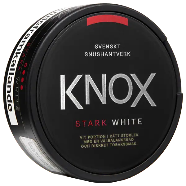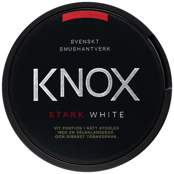 Skruf Knox Stark White Portionssnus är ett portionssnus som har smak av klassisk tobak med inslag av citrus. Prillorna har en torr yta som minskar rinnighet, samtidigt som innehållet behåller fukten, vilket ger en jämn och långvarig smakupplevelse.