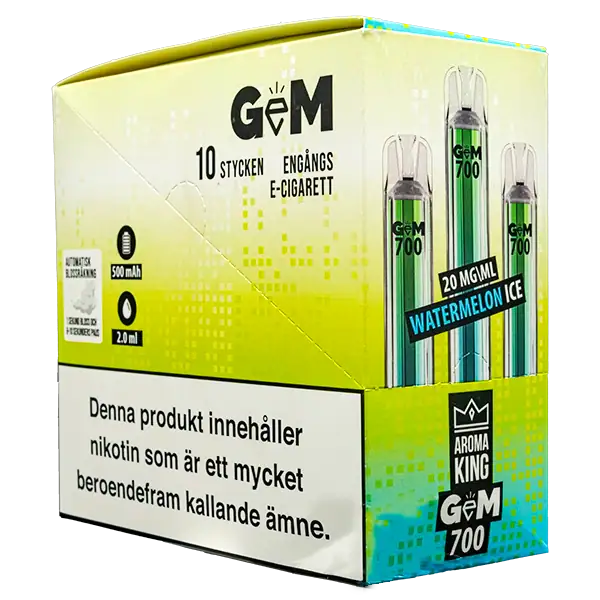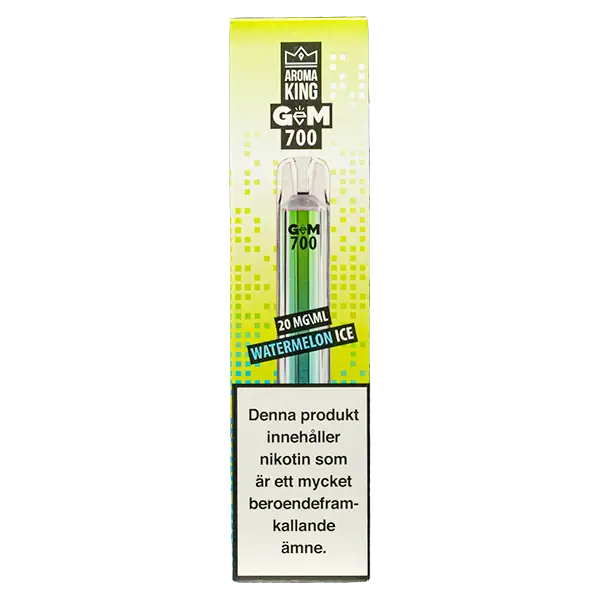 Aroma King Gem Bar Watermelon Ice 20 mg är förfylld med 2 ml e-vätska. Produkten kräver inget underhåll och aktiveras vid inhalering, produkten är redo att användas direkt ur förpackningen. Produkten innehåller nikotinsalt som är aningen mildare för halsen.