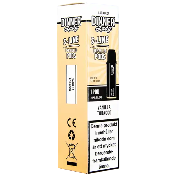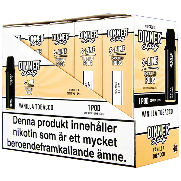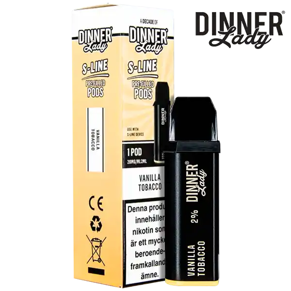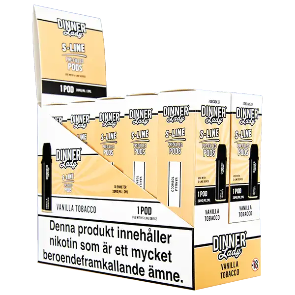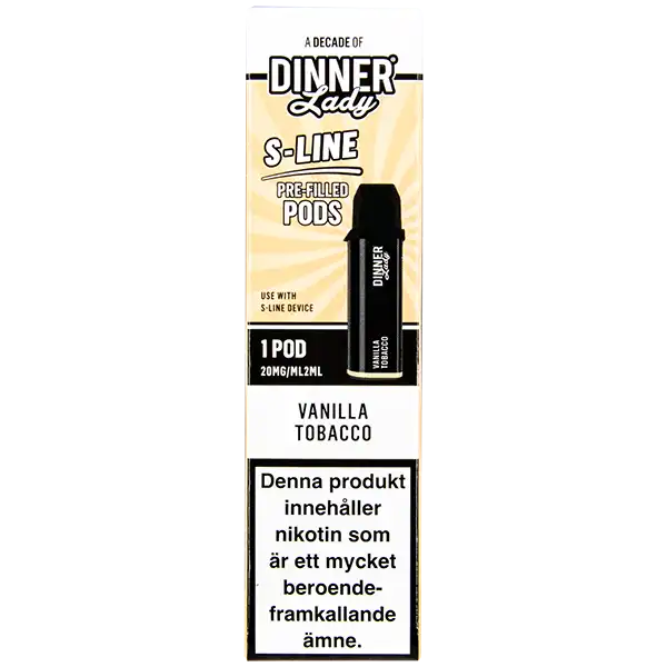 Detta är en förfylld podd som tillhör Dinner Lady S-Line podsystem. Poden innehåller nikotin och kommer påfylld med 2 ml e-juice per pod. Dinner Lady S-Line Pod Vanilla Tobacco har smakämnen av vanilj och tobak, dessutom ger dessa poddar upp till hela 800 puffar per pod. Podden innehåller 20 mg/ml.