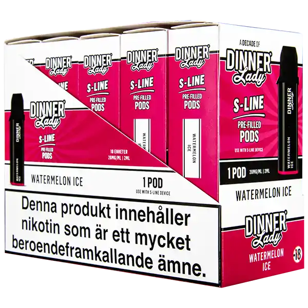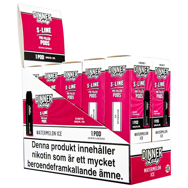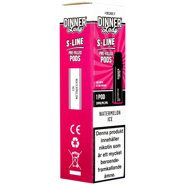 Detta är en förfylld podd som tillhör Dinner Lady S-Line podsystem. Poden innehåller nikotin och kommer påfylld med 2 ml e-juice per pod. Dinner Lady S-Line Pod Watermelon Ice har smakämnen av vattenmelon, dessutom ger dessa poddar upp till hela 800 puffar per pod. Podden innehåller 20 mg/ml.