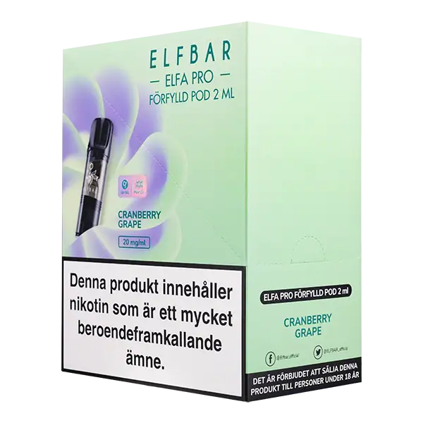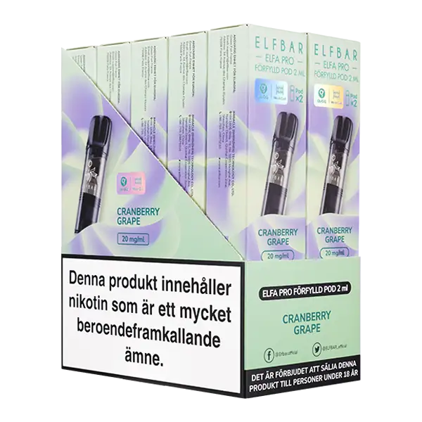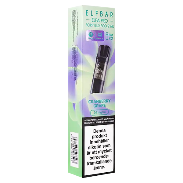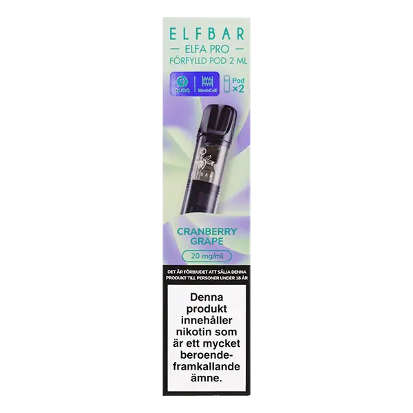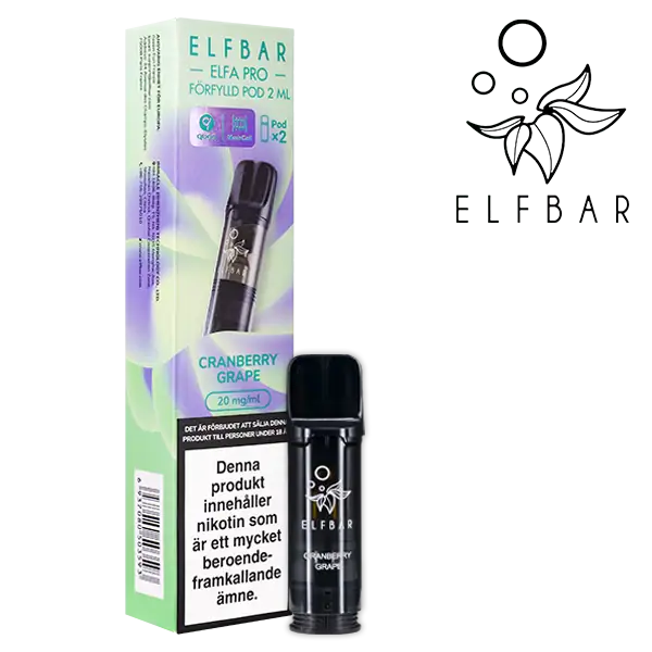 Elfa PRO Pod Cranberry Grape 20 mg är förfyllda poddar som säljs i 2-pack och har en tydlig smak av tranbär och vindruvor.