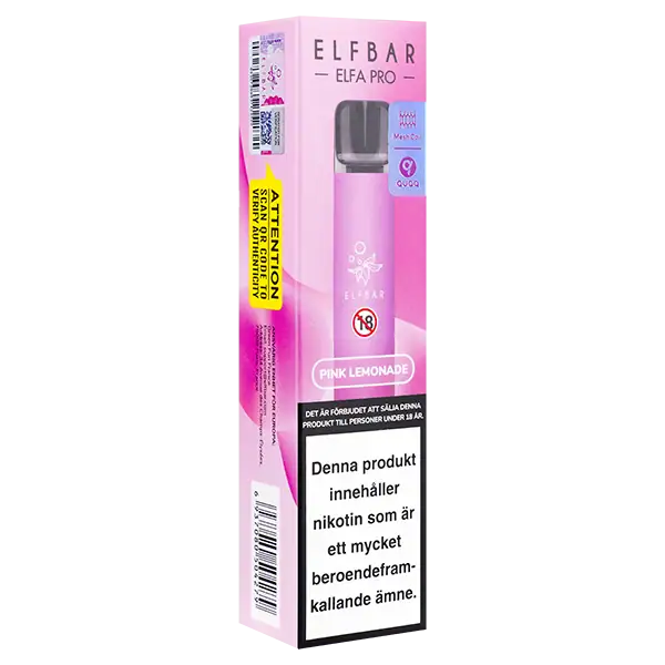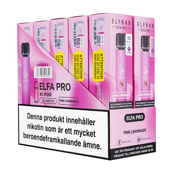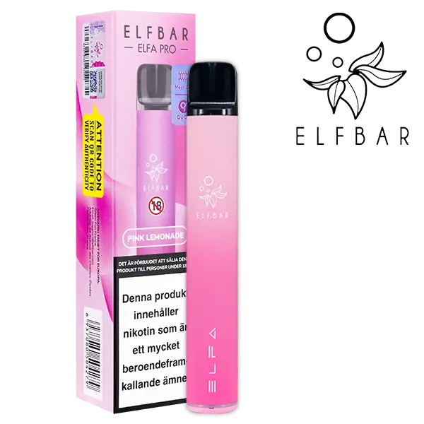 Elfa PRO Pod Kit Aurora Pink är ett podsystem kit som består av ett laddningsbart batteri och en pod på 20 mg nikotinsalt. Den förfyllda podden har en tydlig smak av lemonad.