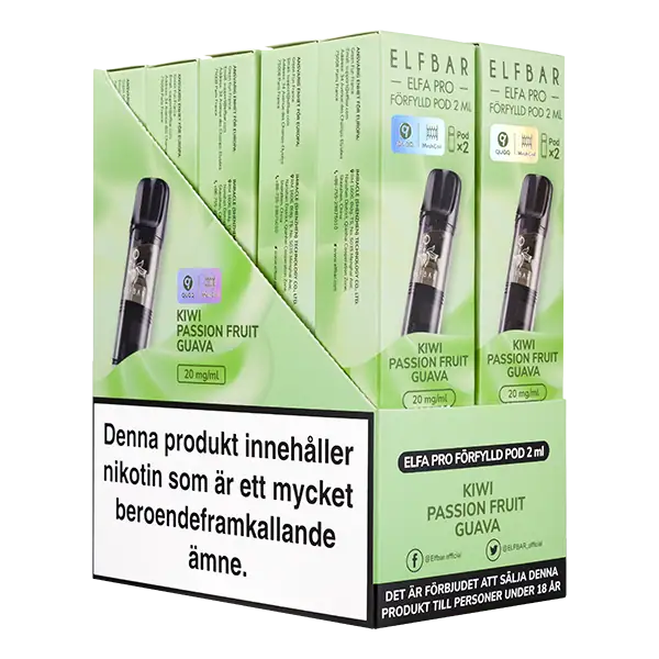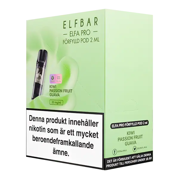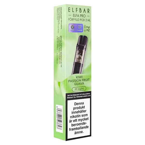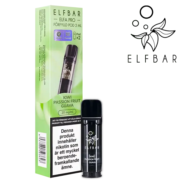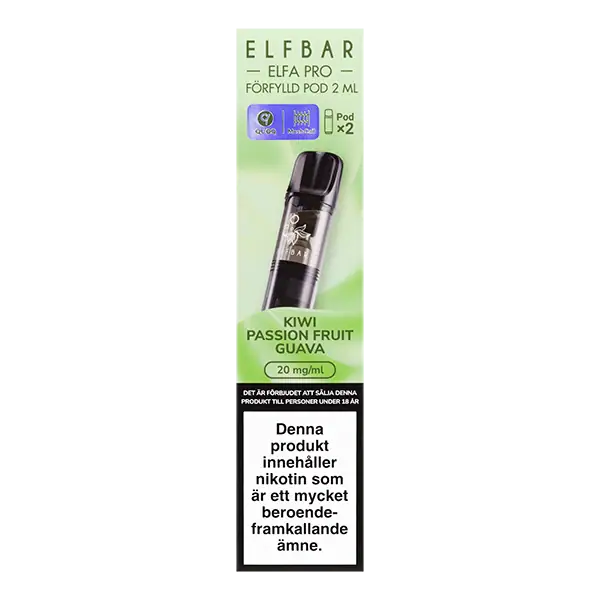 Elfa PRO Pod Kiwi Passion Fruit Guava 20 mg är förfyllda poddar som säljs i 2-pack och har en tydlig smak av kiwi, passionsfrukt och guava.
