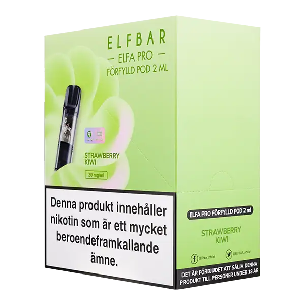 Podsystemet från Elfa PRO Pod Strawberry Kiwi 20 mg är poddar som är utrustade med barnlås. Elfbar podsystem fungerar enbart till PRO Pro batterier. Podsystemet är uppdelat i två delar, en uppladdningsbar batteridel och förfyllda poddar med 2 ml e-vätska. Batterierna säljs separat per styck och smakpoddarna såsom Elfa PRO Pod Strawberry Kiwi 20 mg säljes separat.