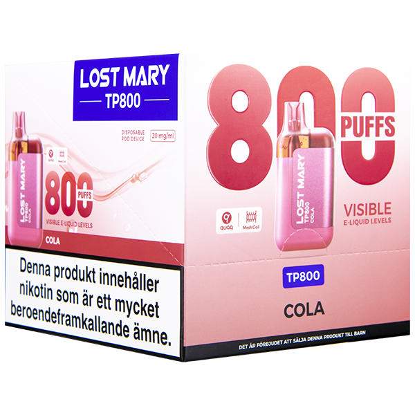 Lost Mary TP800 finns i flera olika smaker. Vill du se hela utbudet online gör du det enkelt här. Vid användning ger Lost Mary TP800 Cola ett måttligt luftmotstånd och tydlig smak, utan behov av några inställningar eller påfyllningar. Lost Mary TP800 är avsedd för engångsbruk.