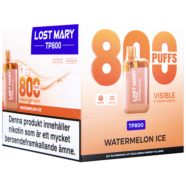 Lost Mary TP800 finns i flera olika smaker. Vill du se hela utbudet online gör du det enkelt här. Vid användning ger Lost Mary TP800 Watermelon Ice ett måttligt luftmotstånd och tydlig smak, utan behov av några inställningar eller påfyllningar. Lost Mary TP800 är avsedd för engångsbruk.