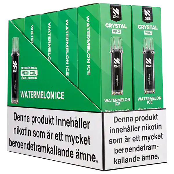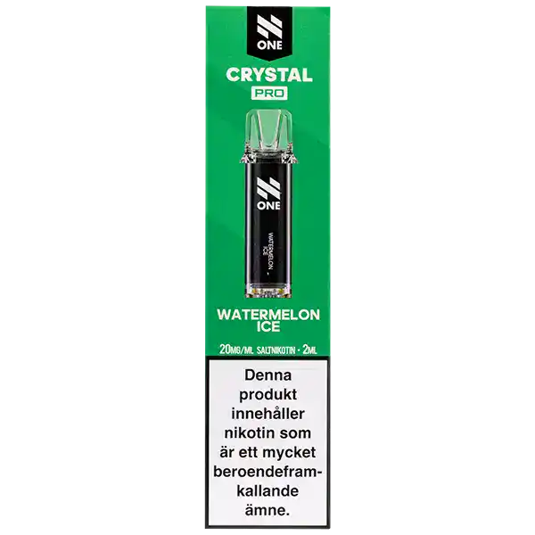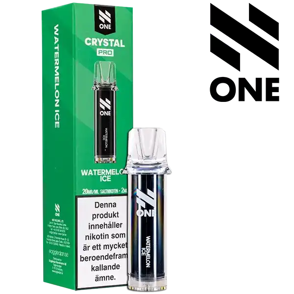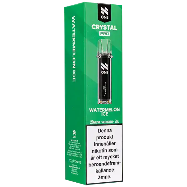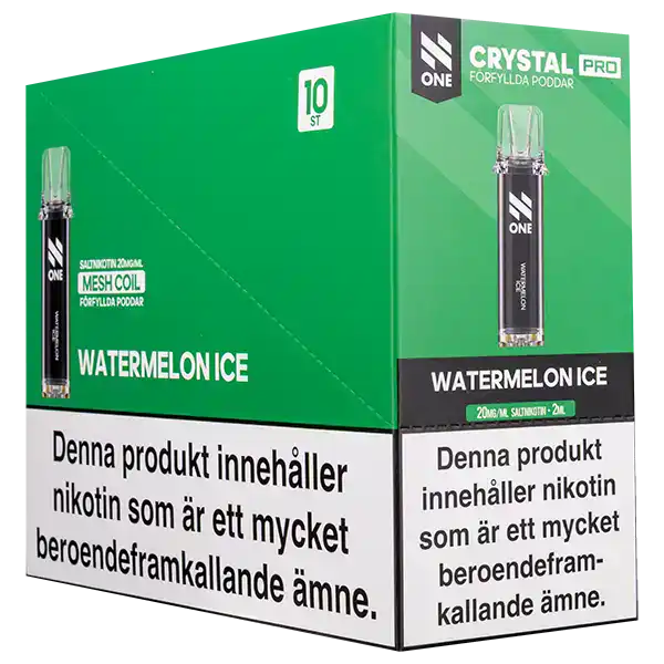N One Crystal PRO Pod Watermelon Ice är förfyllda poddar med 2 ml e-vätska som innehåller nikotinsalt. Poddarna kommer med en tydlig och kylande smak av vattenmelon. Kapslarna från N One är designade för att enbart fungera tillsammans med ett kompatibelt Crystal PRO Batteri.